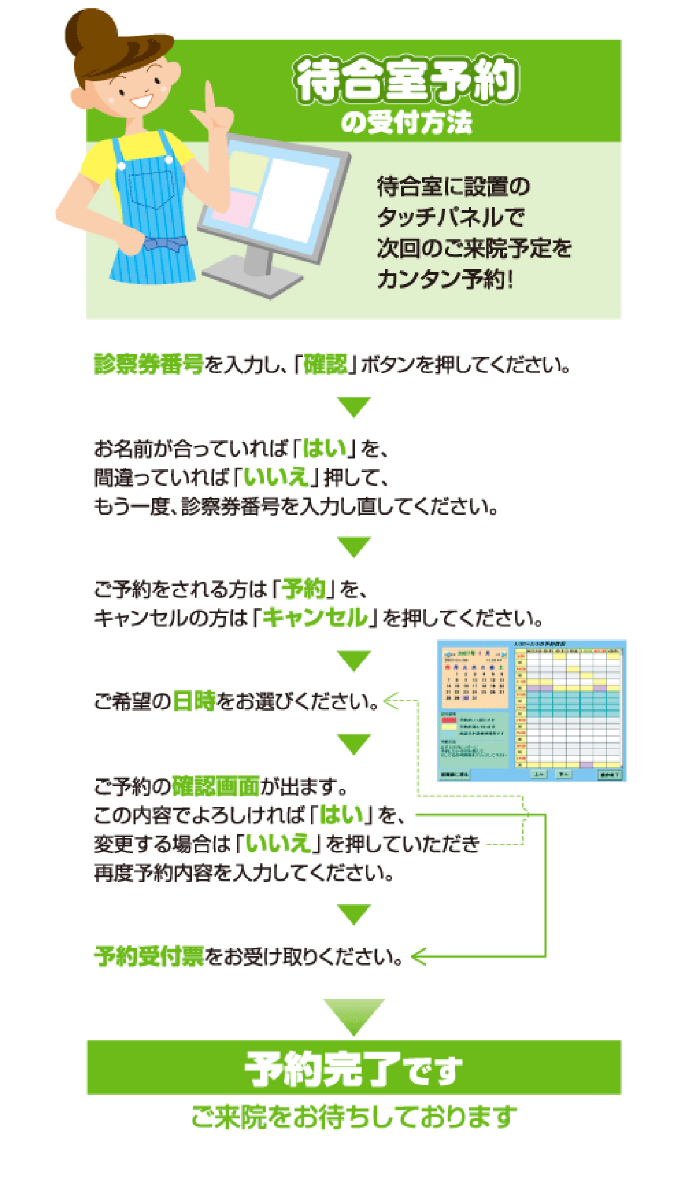 - 診察内容により、順番が前後する場合がございます。ご了承ください。