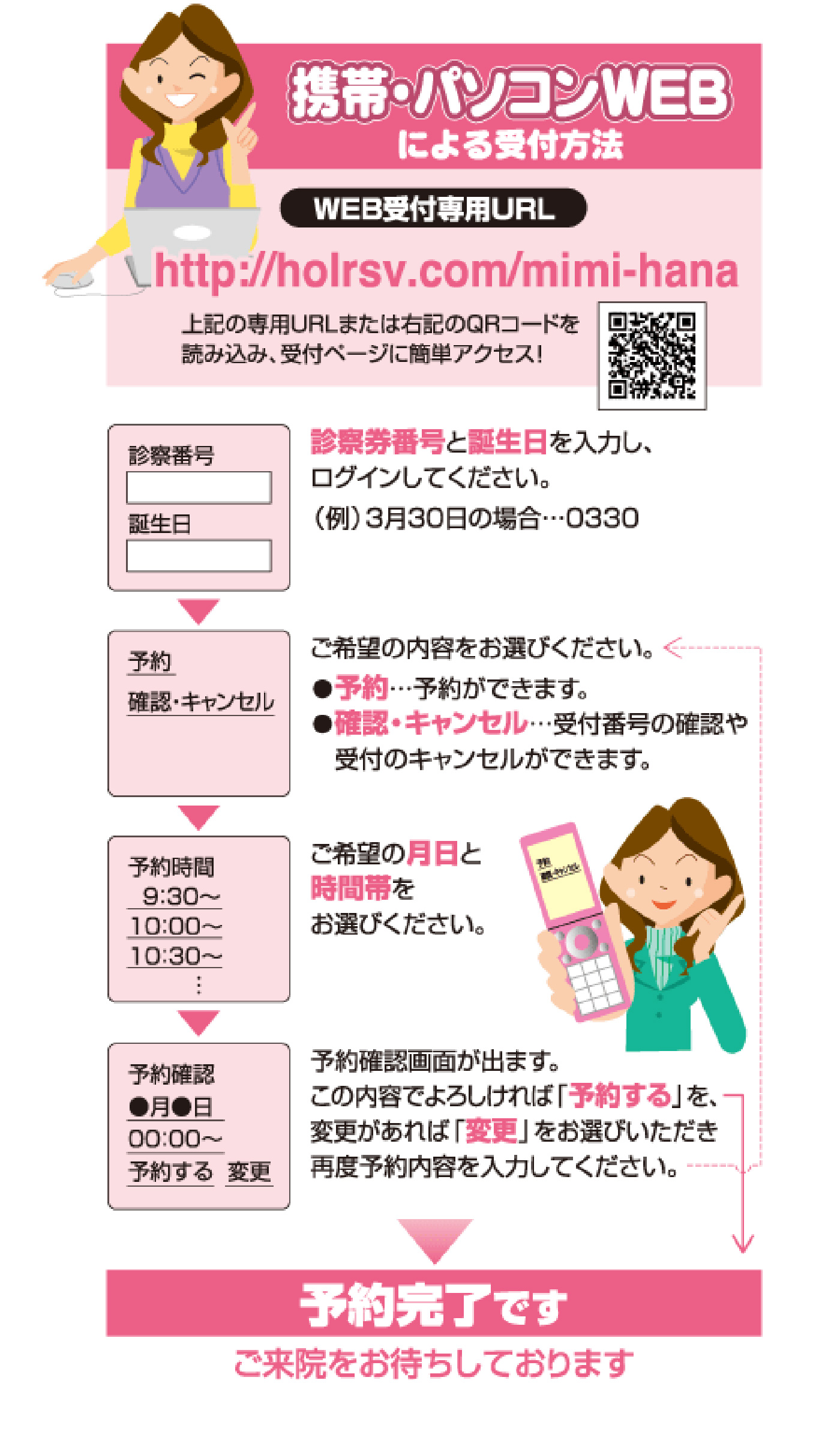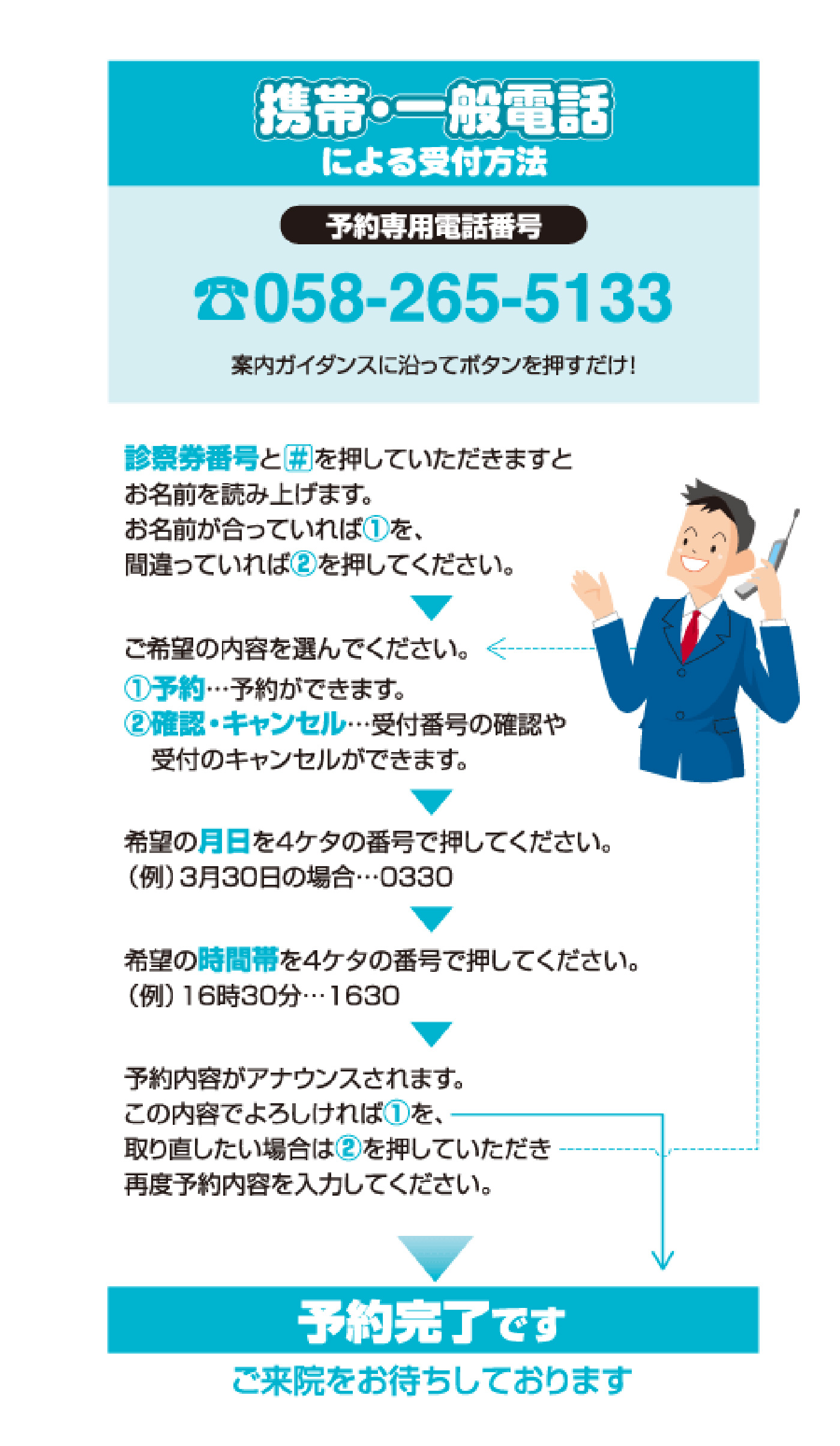 上記の方法でうまく予約ができない方は、直接お電話でご予約ください。